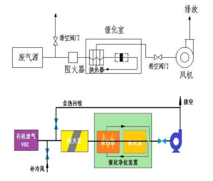 1.工藝原理 催化氧化技術(shù)(Catalytic Oxidizer,簡稱CO),通常是指將廢氣加熱到280℃以上,在催化劑的作用下將廢氣分解成CO2和和H2O,催化產(chǎn)生的高溫?zé)崃勘话迨綋Q熱器進(jìn)行循環(huán)熱交換,從而節(jié)省運(yùn)行能